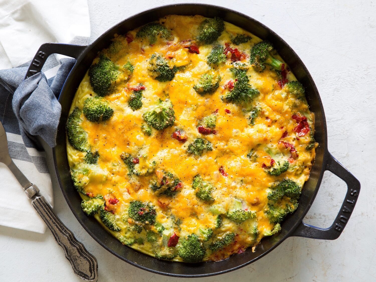 Whisk together eggs, milk, cheese, roasted red pepper, salt, and crushed pepper in a bowl. Gradually pour over broccoli mixture in skillet.