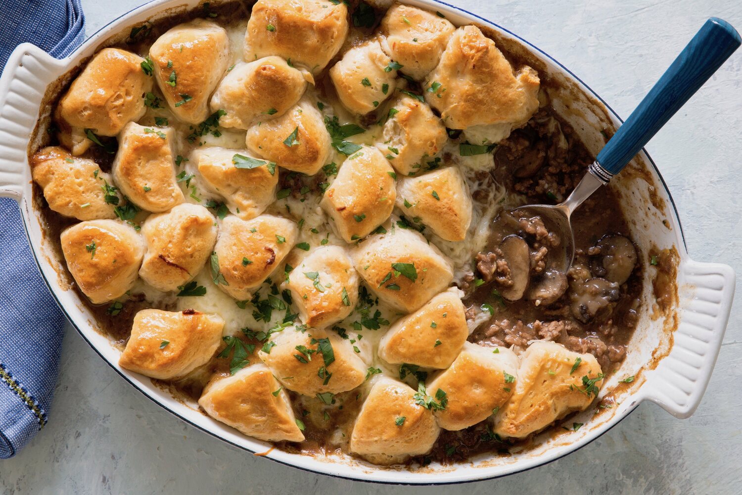 Sprinkle cheese over meat mixture. Cut biscuits into quarters, and arrange over cheese. Transfer skillet to oven.