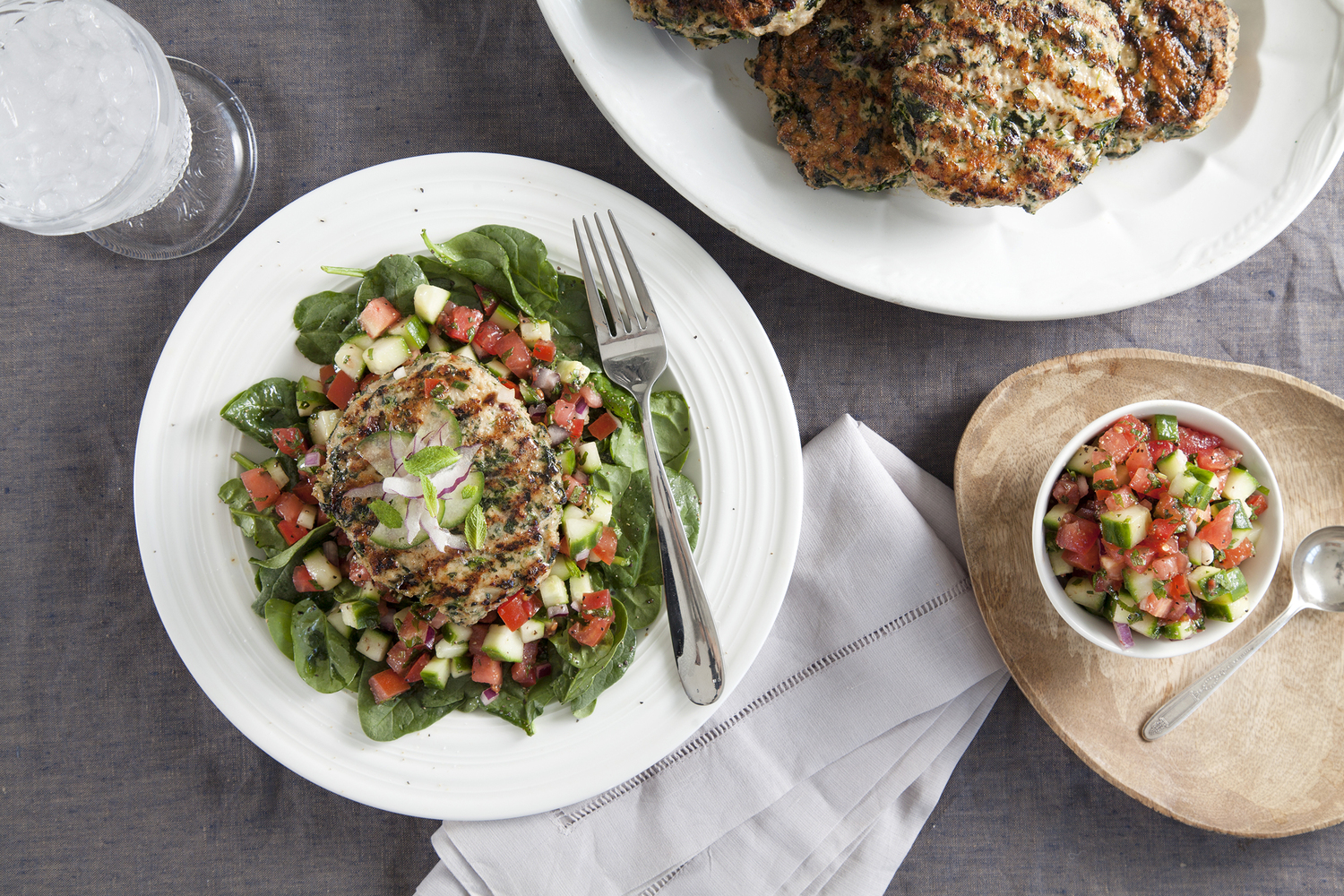 - Stir together turkey, chopped spinach, almond four, ¼ cup red onion, 2 Tbsp mint, Greek seasoning, lemon rind and egg in a large bowl. Shape into 6 patties.