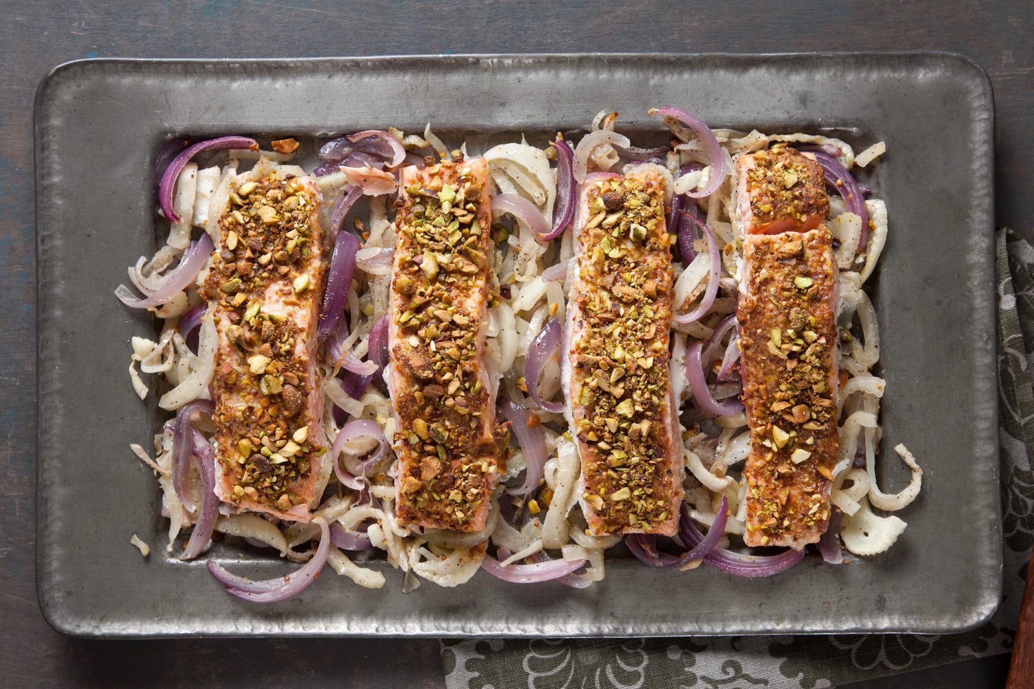 - Stir together mustard and honey; brush over salmon. Sprinkle with pistachios, pressing gently to adhere.