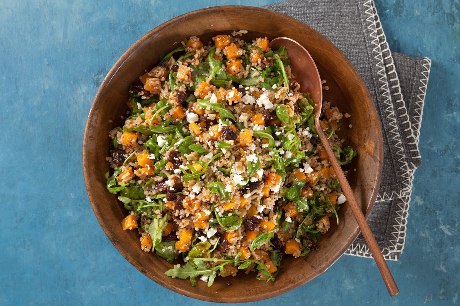 5. Transfer cooked quinoa to a serving bowl; add baked squash, vinaigrette, walnuts, feta and arugula.