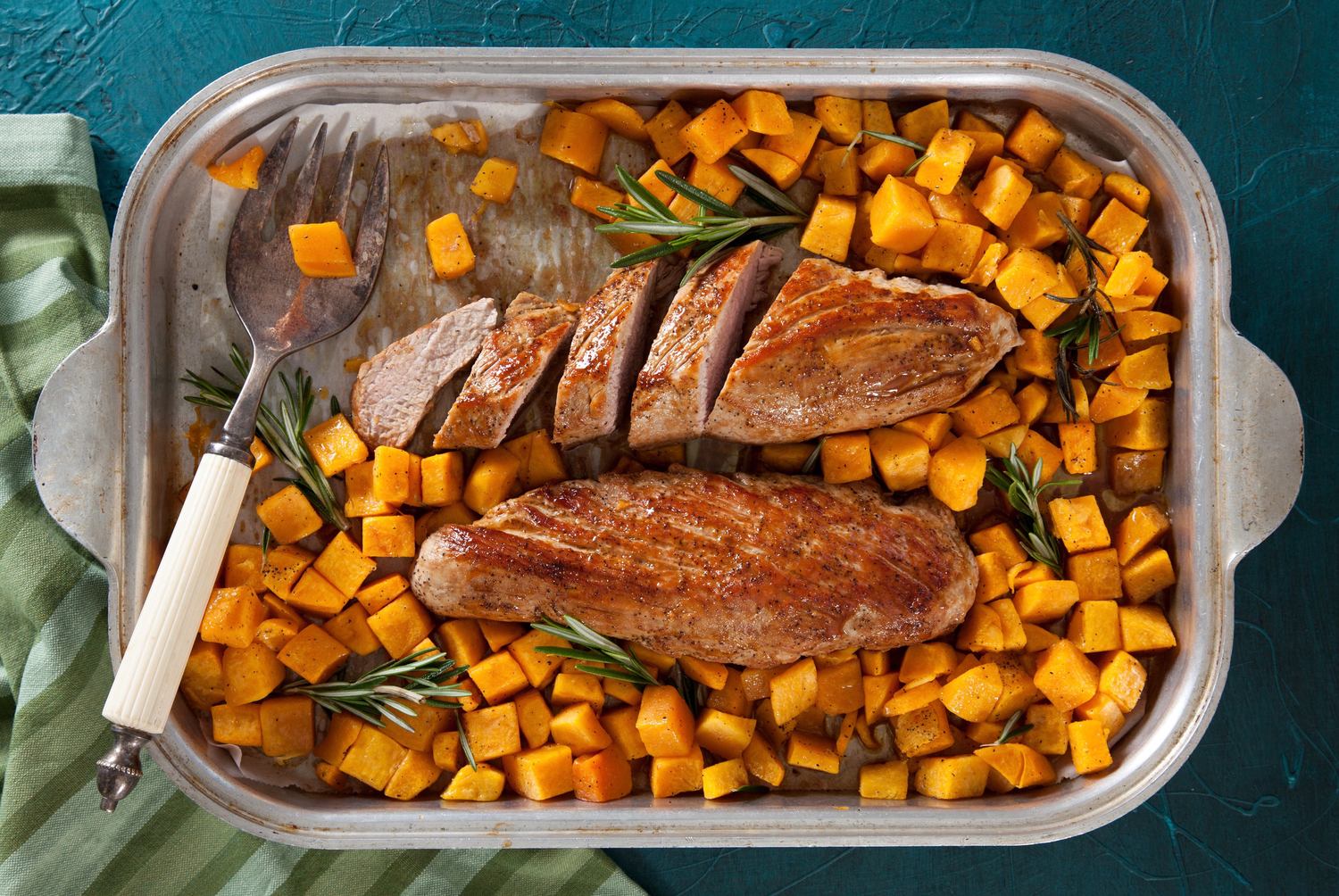 - Toss sweet potatoes with remaining 1½ Tbsp oil. Season with salt and pepper; arrange potatoes and rosemary around pork.