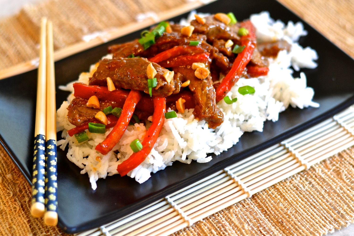 - Return beef to skillet, and add peanut sauce; cook until thoroughly heated. Sprinkle with green onions and peanuts.