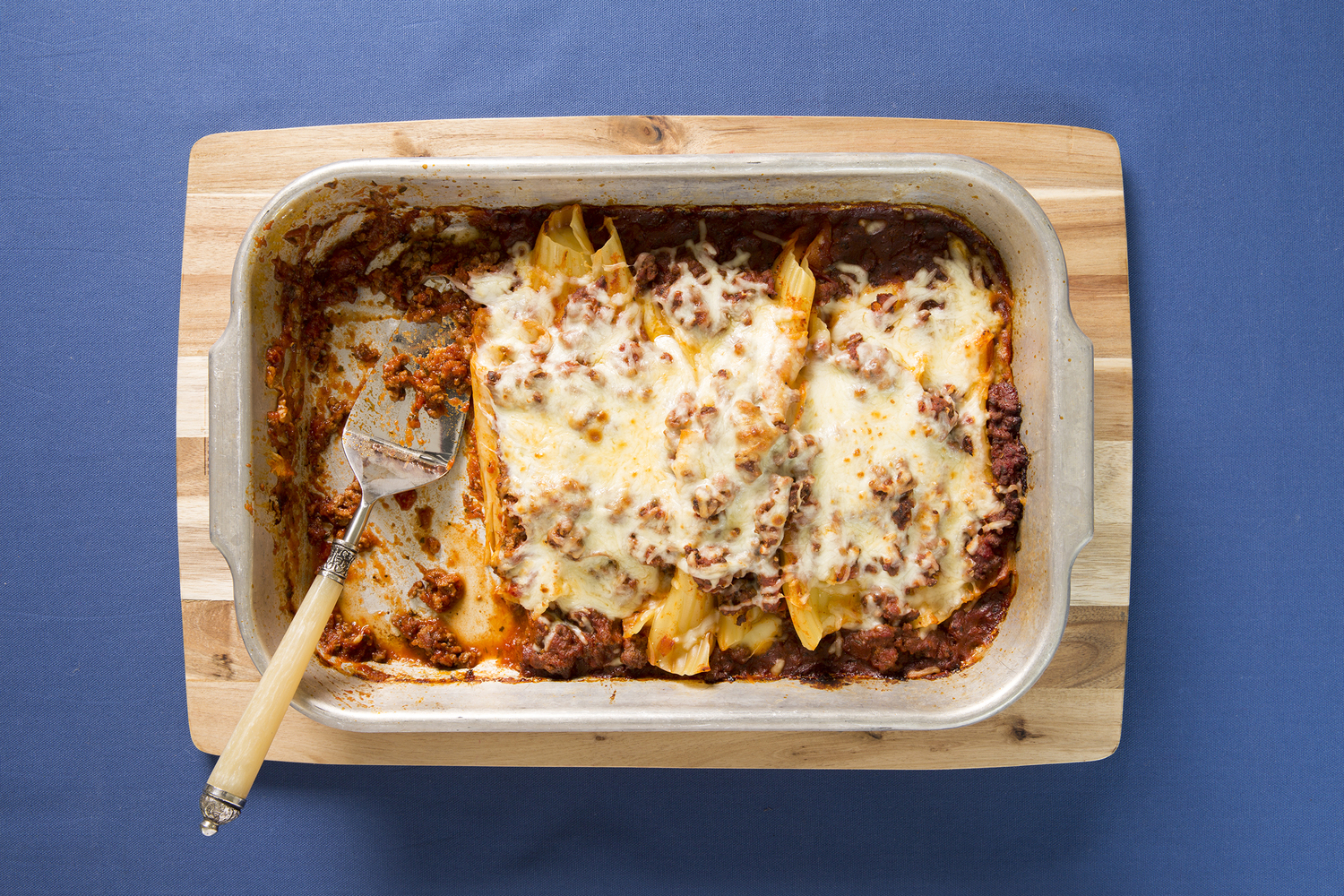 - Spoon half of beef mixture into a greased 13- x 9-inch baking dish.