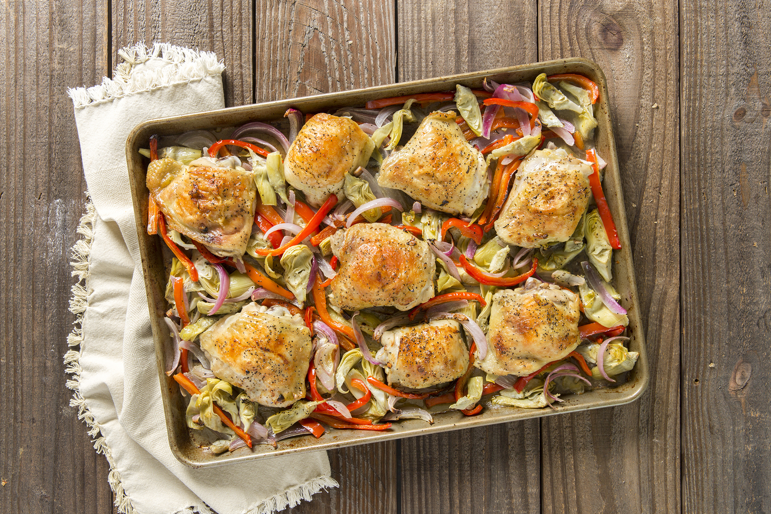 - Drain chicken and artichokes; discard marinade. Arrange chicken on a large rimmed baking sheet, skin sides up. Arrange artichokes, bell peppers, and onion around chicken; sprinkle lightly with salt and pepper.