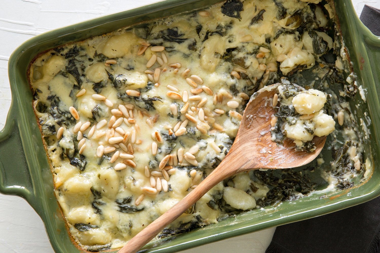- Stir in spinach and gnocchi; spoon into a 2-quart baking dish coated with cooking spray. Sprinkle with Parmesan and nuts. Bake 15 minutes or until golden.