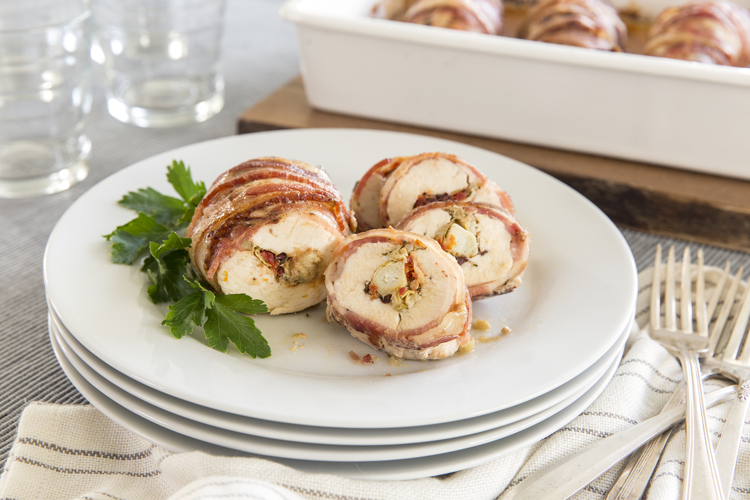 - Spoon artichoke mixture down center of each chicken breast; fold chicken over to enclose filling. Wrap each breast with 4 slices bacon; place, seam sides down, in a baking dish.