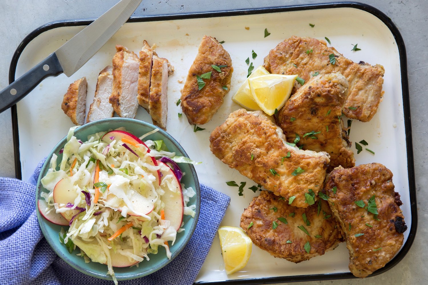- Cook pork, in 2 batches, in 2 Tbsp hot oil per batch 4 to 5 minutes per side or until golden brown. Season lightly with salt and pepper while warm; drizzle lemon juice over pork.