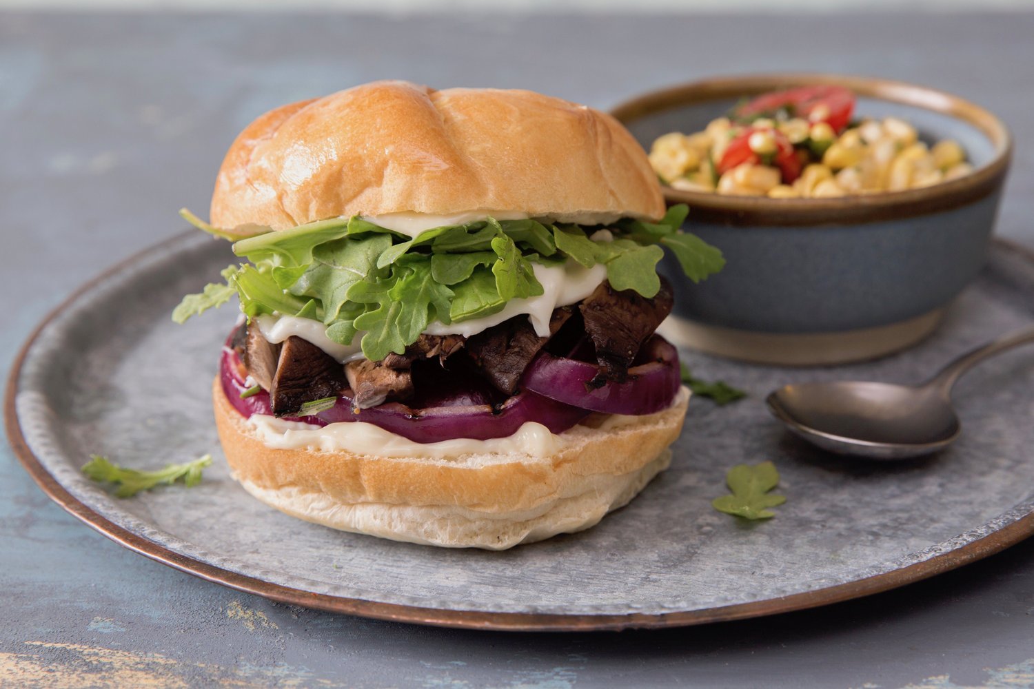 - Spread mayonnaise on cut sides of buns. Serve mushrooms, onion, and arugula on buns.