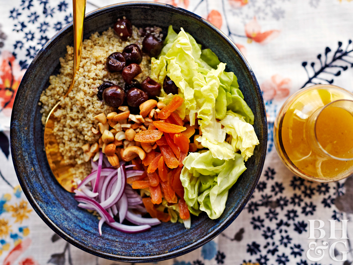 - In a large bowl combine quinoa and next four ingredients (through red onion). Add lettuce. Drizzle with ½ cup of the honey vinaigrette; toss to coat. Pass remaining vinaigrette.