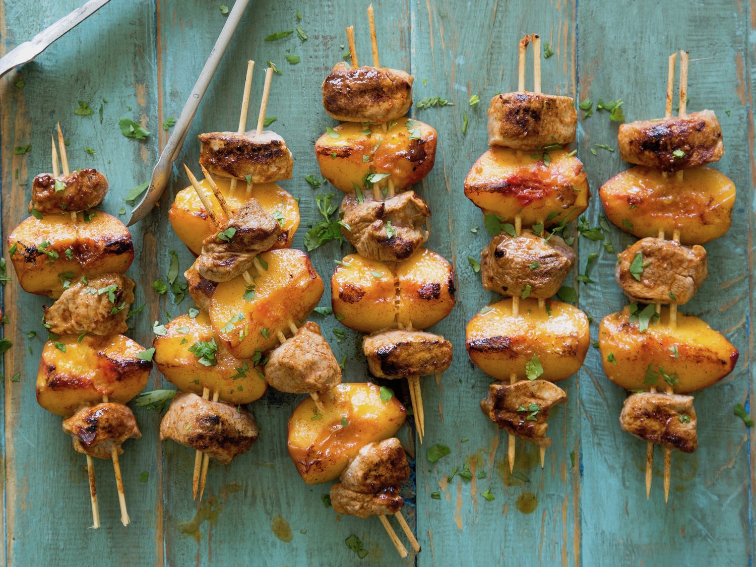 - Preheat grill to medium-high heat. Thread pork and peaches alternately onto double metal or bamboo skewers.