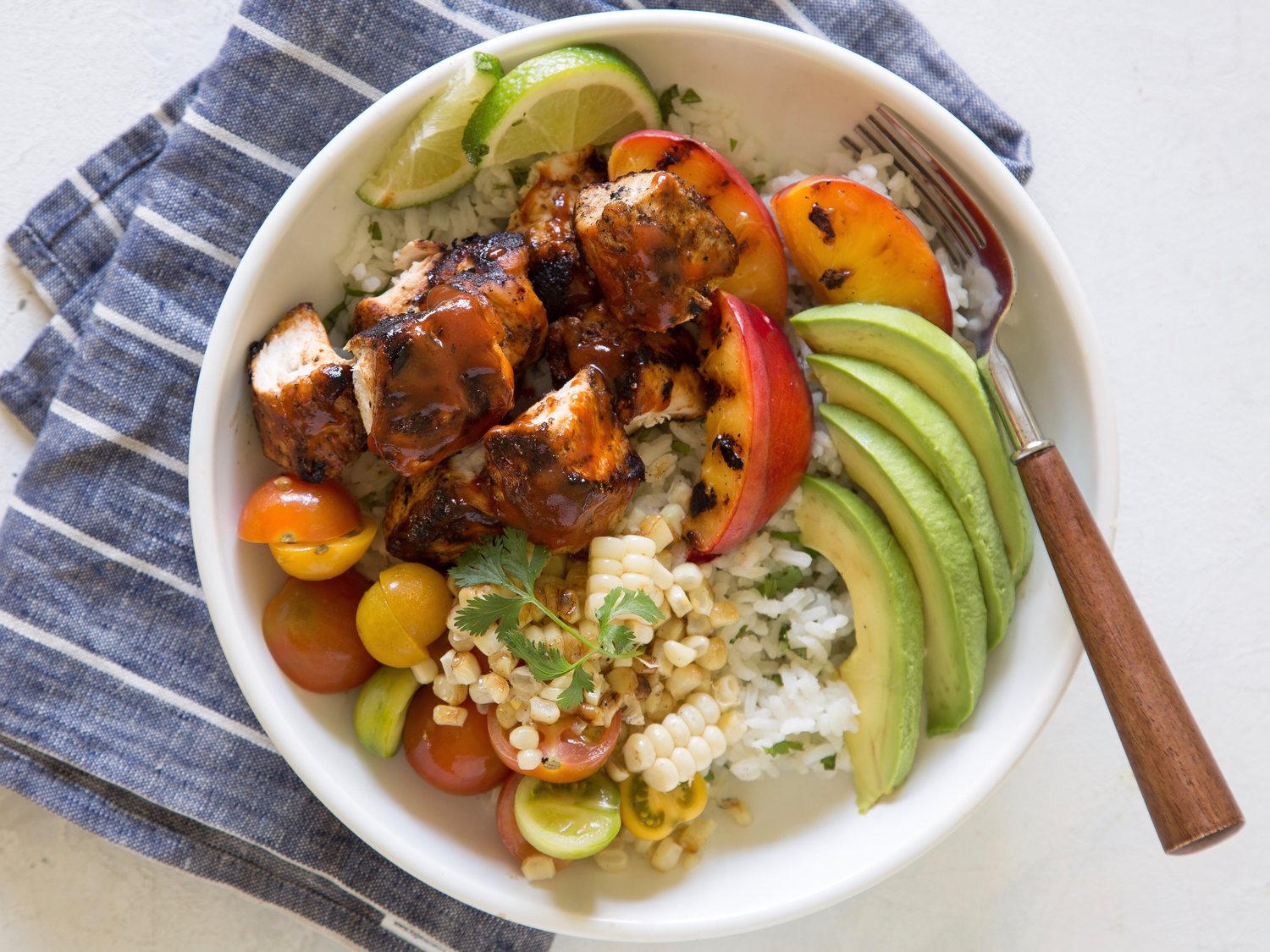 - Divide rice between 2 bowls. Top each with chicken, corn, peaches, tomatoes, and avocado. Serve with additional barbecue sauce, if desired.
