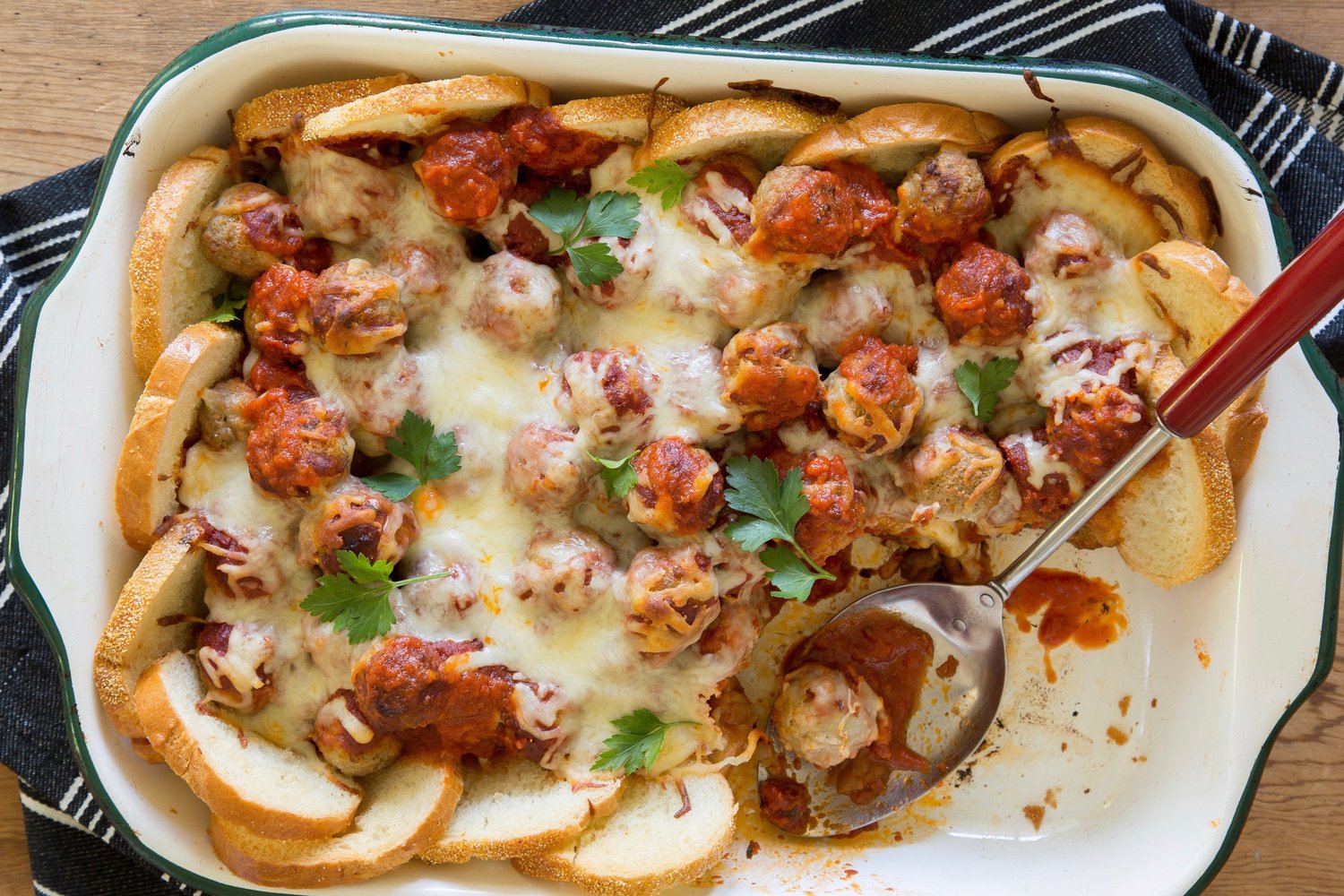 - Stir together meatballs and pasta sauce; spoon over bread. Bake 15 minutes or until hot and bubbly; sprinkle with cheese, and bake 5 minutes longer or until melted.