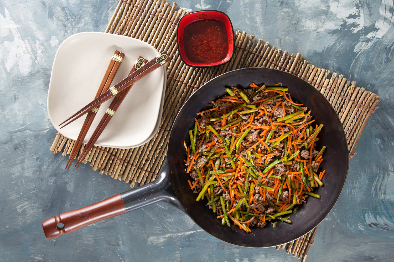 - Cook beef in a large skillet over medium heat until browned and crumbly. Drain and return to skillet. Stir in asparagus, carrots, onions, and garlic; cook, stirring often, 2 minutes.