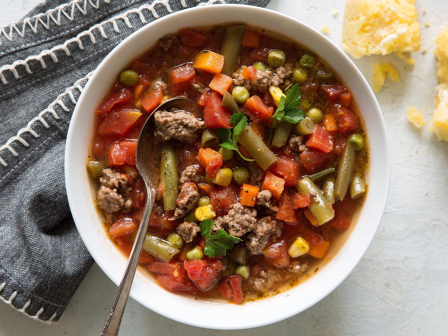 - Cook beef in a large Dutch oven over medium heat until browned and crumbly; drain and return to pot. Stir in vegetables, broth, and tomatoes; bring to a boil, and stir in basil. Reduce heat, and simmer 10 minutes.