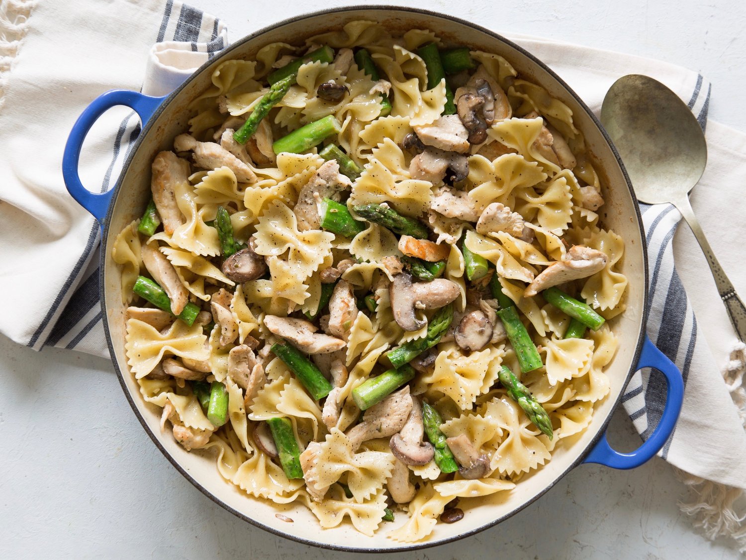 - Heat oil and butter in a large, deep skillet over medium-high heat; add chicken and mushrooms. Cook, stirring often, until chicken is done. Add broth and cheese, stirring until cheese is melted. Stir in pasta and asparagus.