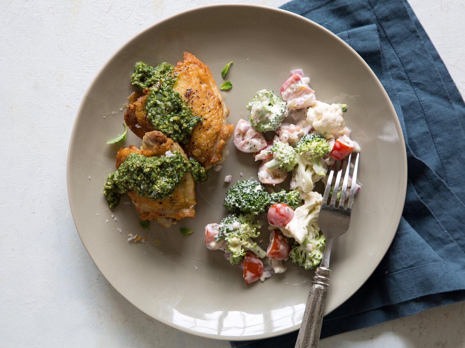 - Season chicken with salt and pepper. Cook in 3 Tbsp hot oil 6 to 8 minutes per side or until done. Serve with pesto.