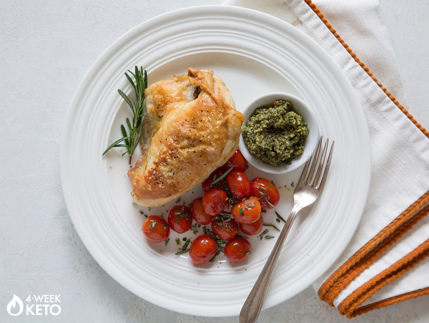 - Preheat oven to 375°F. Place chicken in a large baking dish. Drizzle with olive oil, and sprinkle with ½ tsp each salt and pepper. Bake 45 minutes or until chicken is done. Serve with pesto.