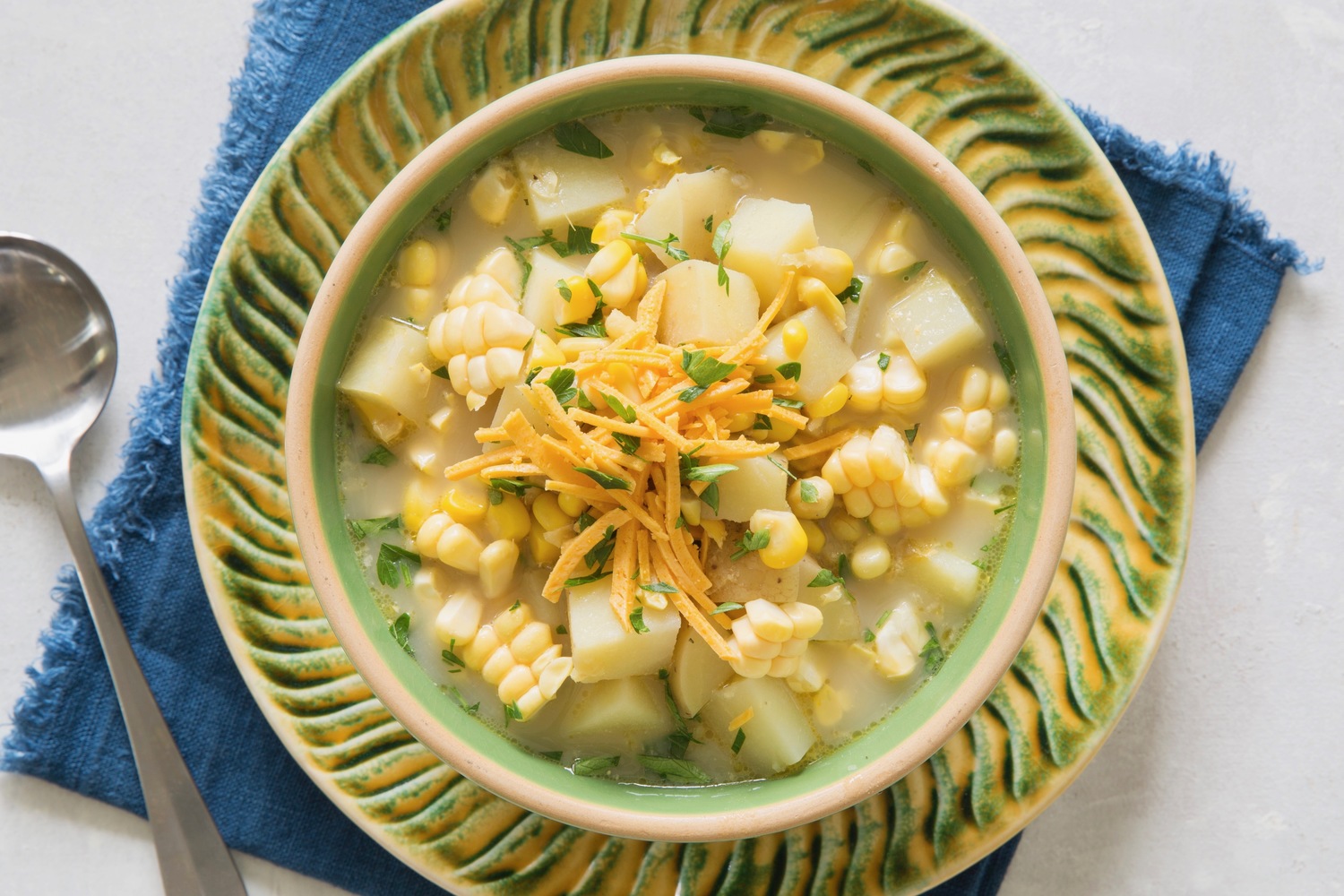 - Scrape corn kernels and juices from cobs into pot; stir in broth, milk, potatoes, and nutritional yeast. Cover, reduce heat, and simmer 15 minutes or until potatoes are tender.