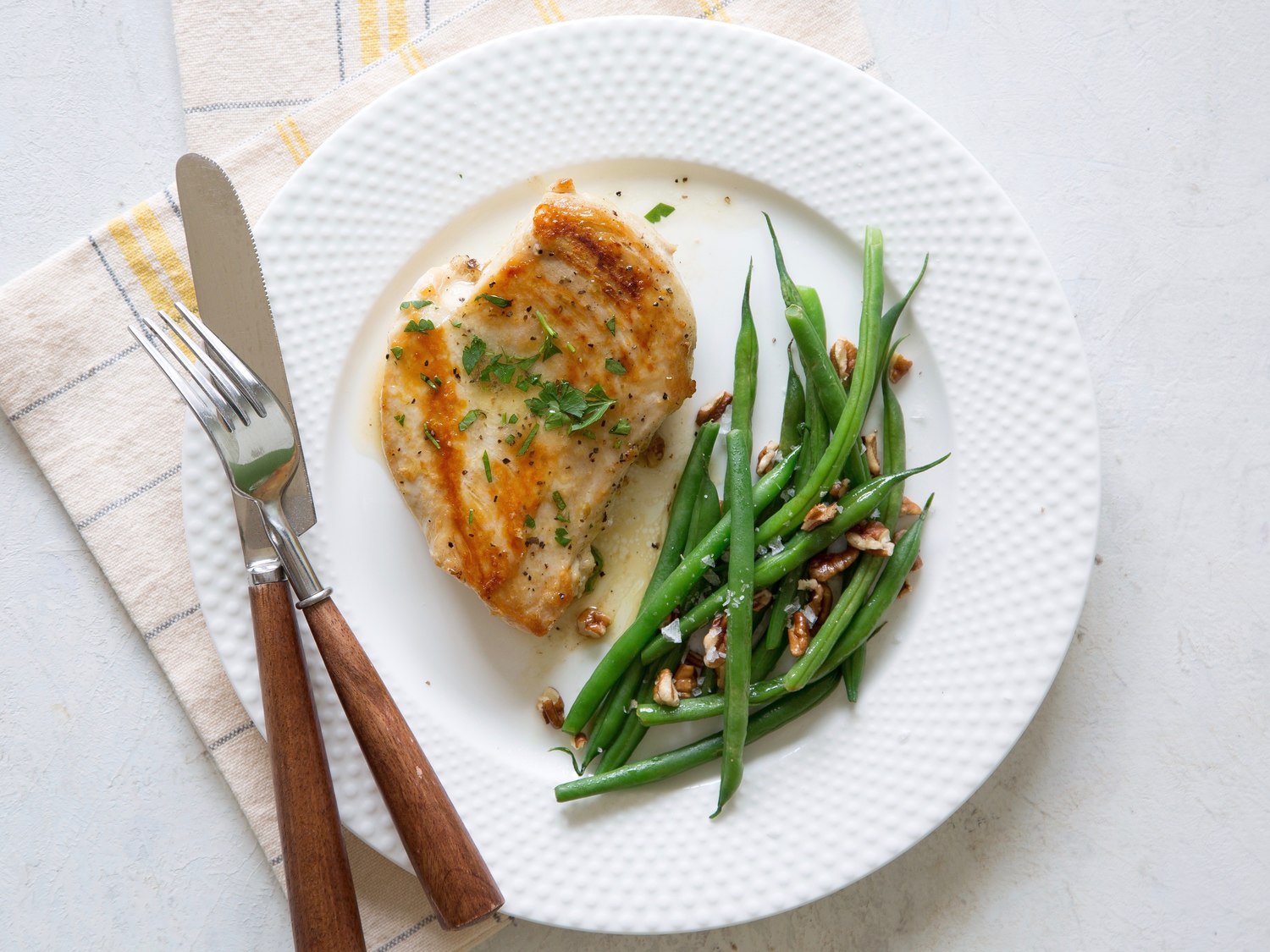 - Place green beans in a bowl; toss with salt, and sprinkle with nuts.