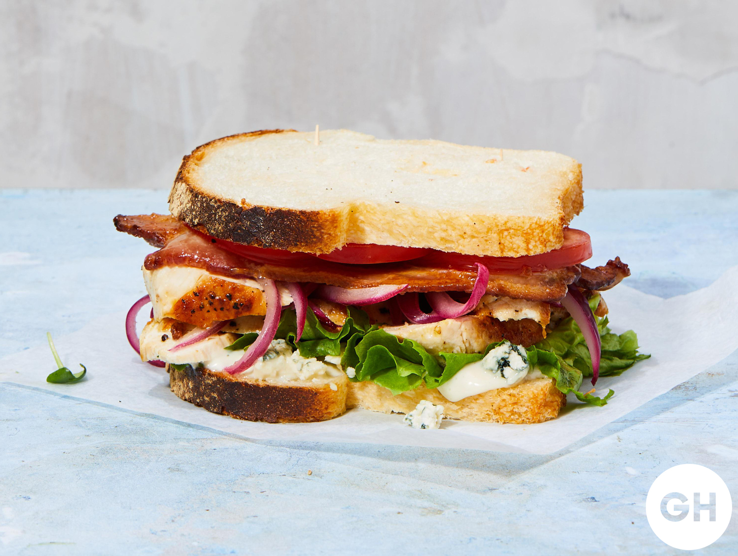 - Spread blue cheese on one side of each slice of bread. Then layer with lettuce, chicken, onion, bacon and tomato. Sandwich with remaining bread.