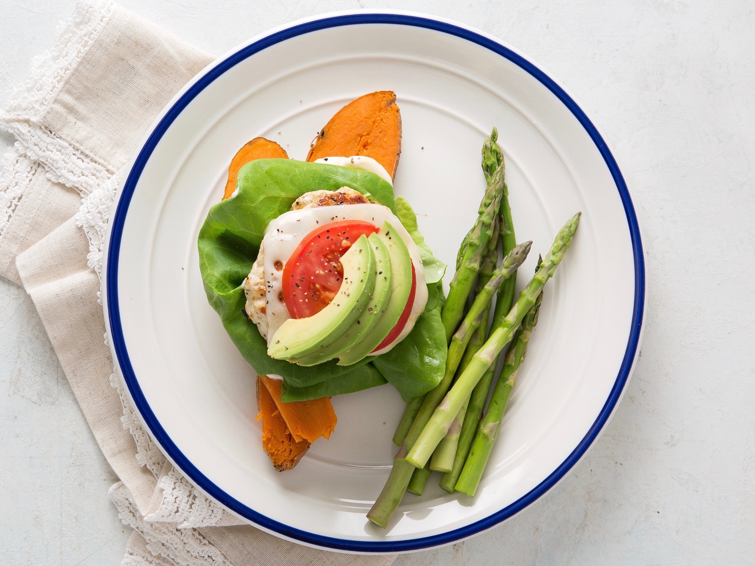 - Whisk together mayonnaise and mustard. Spread over potatoes; top with lettuce, burgers, tomato, and avocado.