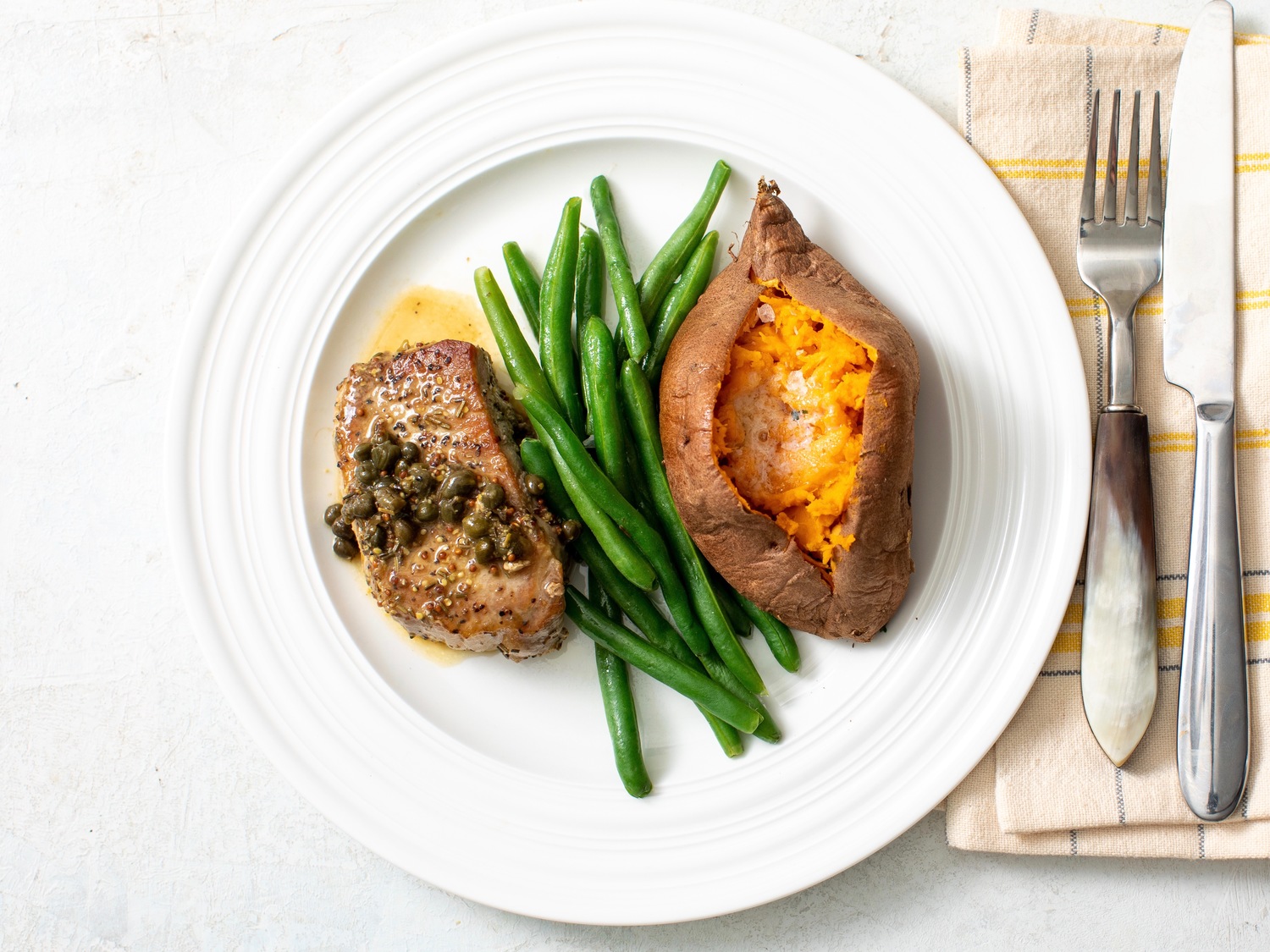 - Add broth; bring to a boil. Stir in mustard, capers, and rosemary; reduce heat, and simmer until sauce is reduced by half and pork is done.