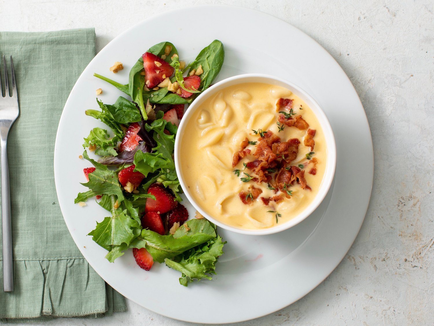 - Meanwhile, bring broth to a boil in a medium saucepan; add macaroni, and cook 6 to 8 minutes or until just tender.