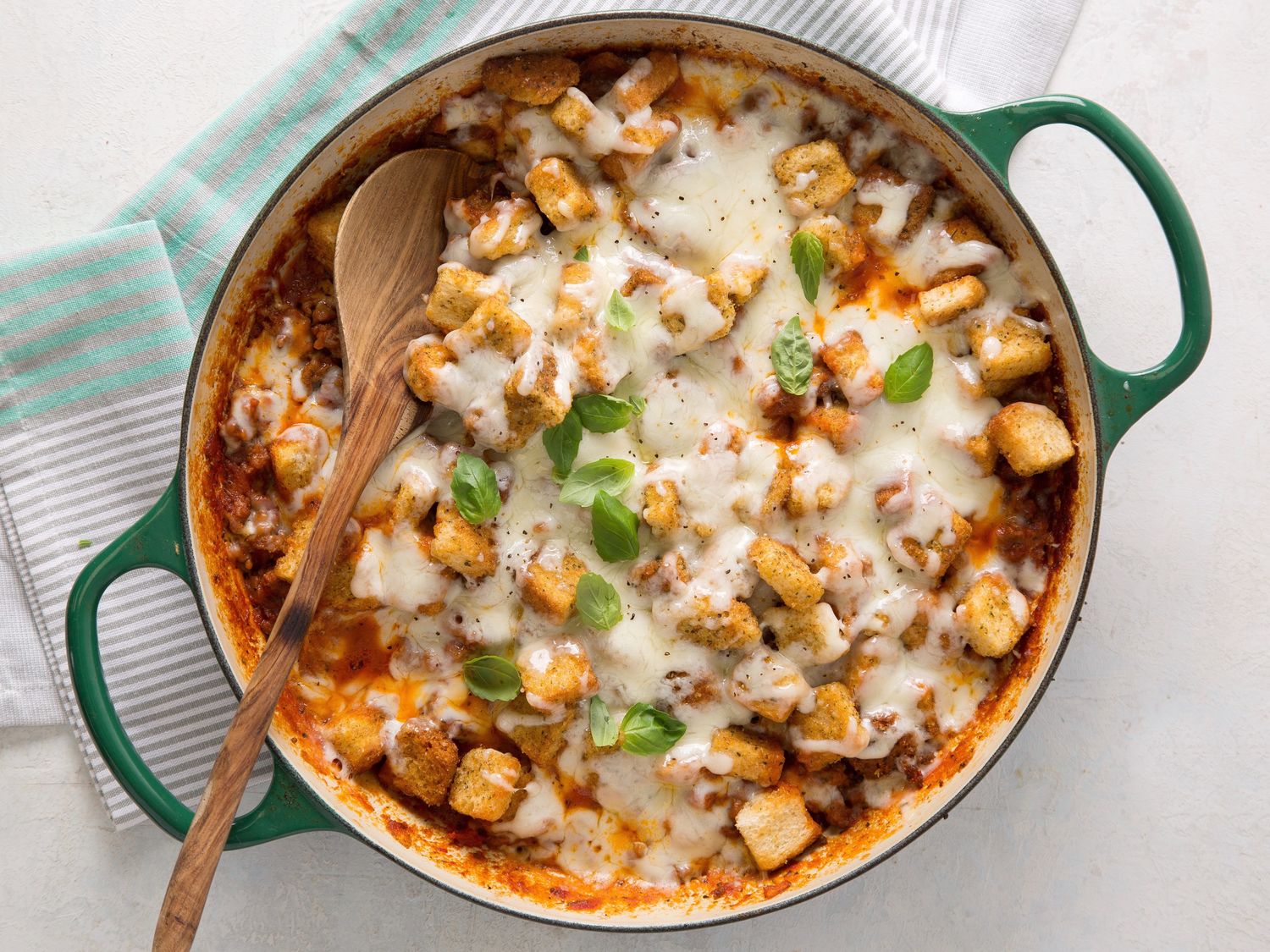- Stir in pizza sauce and water; bring to a boil, reduce heat, and simmer 2 minutes. Top meat mixture with croutons, and sprinkle with cheese. Cover and cook 3 to 4 minutes or until cheese is melted.