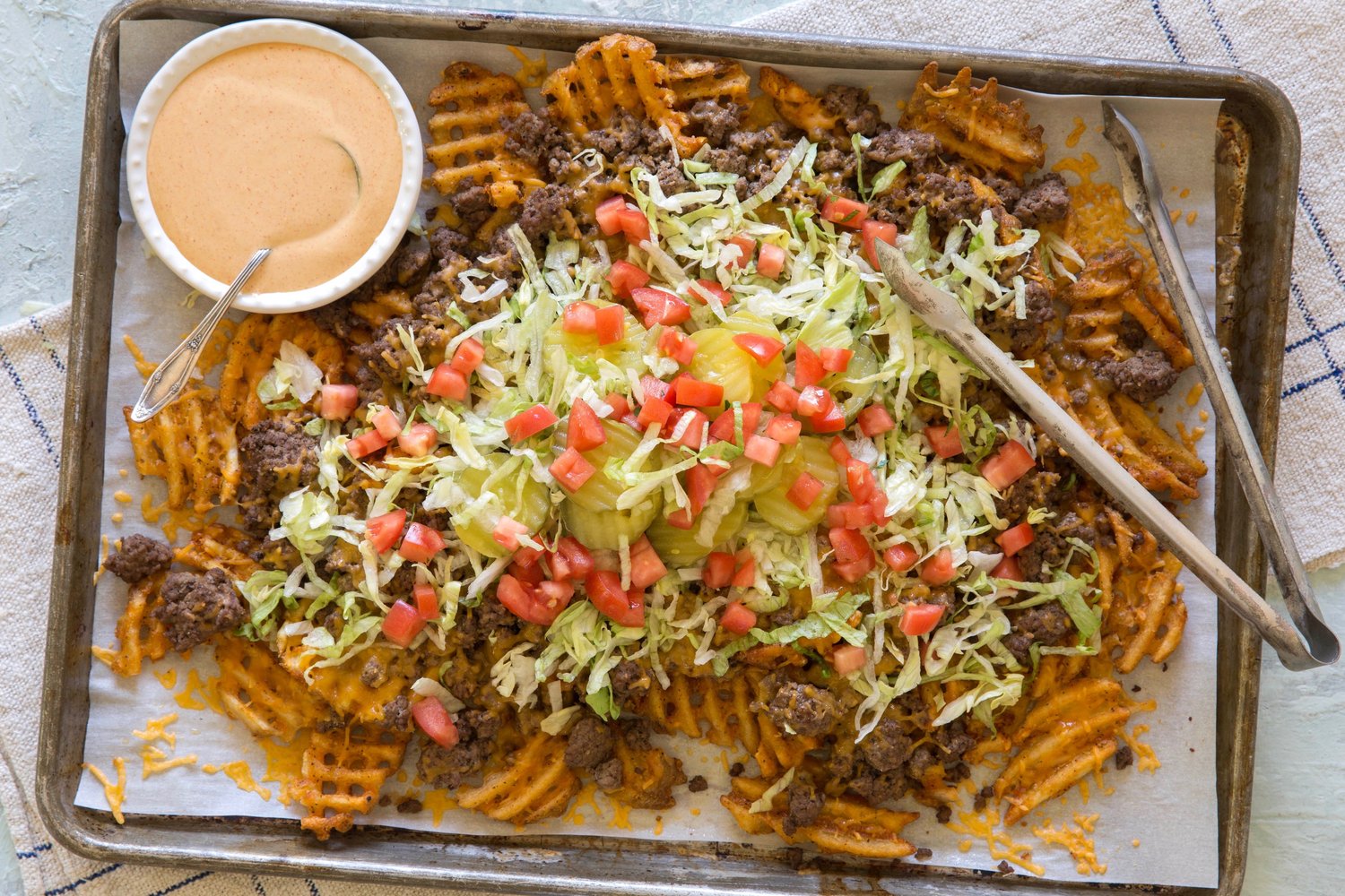 - Spread beef over baked fries. Top with cheese, and bake 5 minutes longer or until cheese is melted. Top with lettuce, tomato, and pickles.