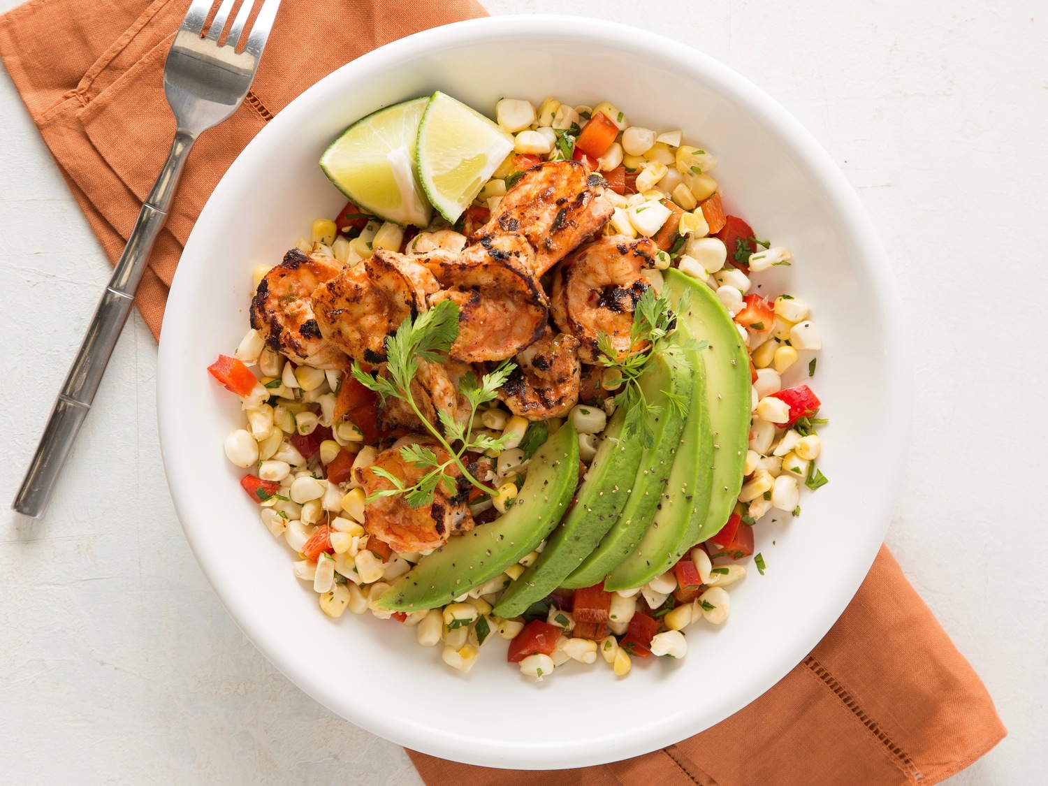 - Meanwhile, combine corn, bell peppers, and cilantro. Spoon mixture into 6 bowls; top with shrimp, avocado, and lime wedges.