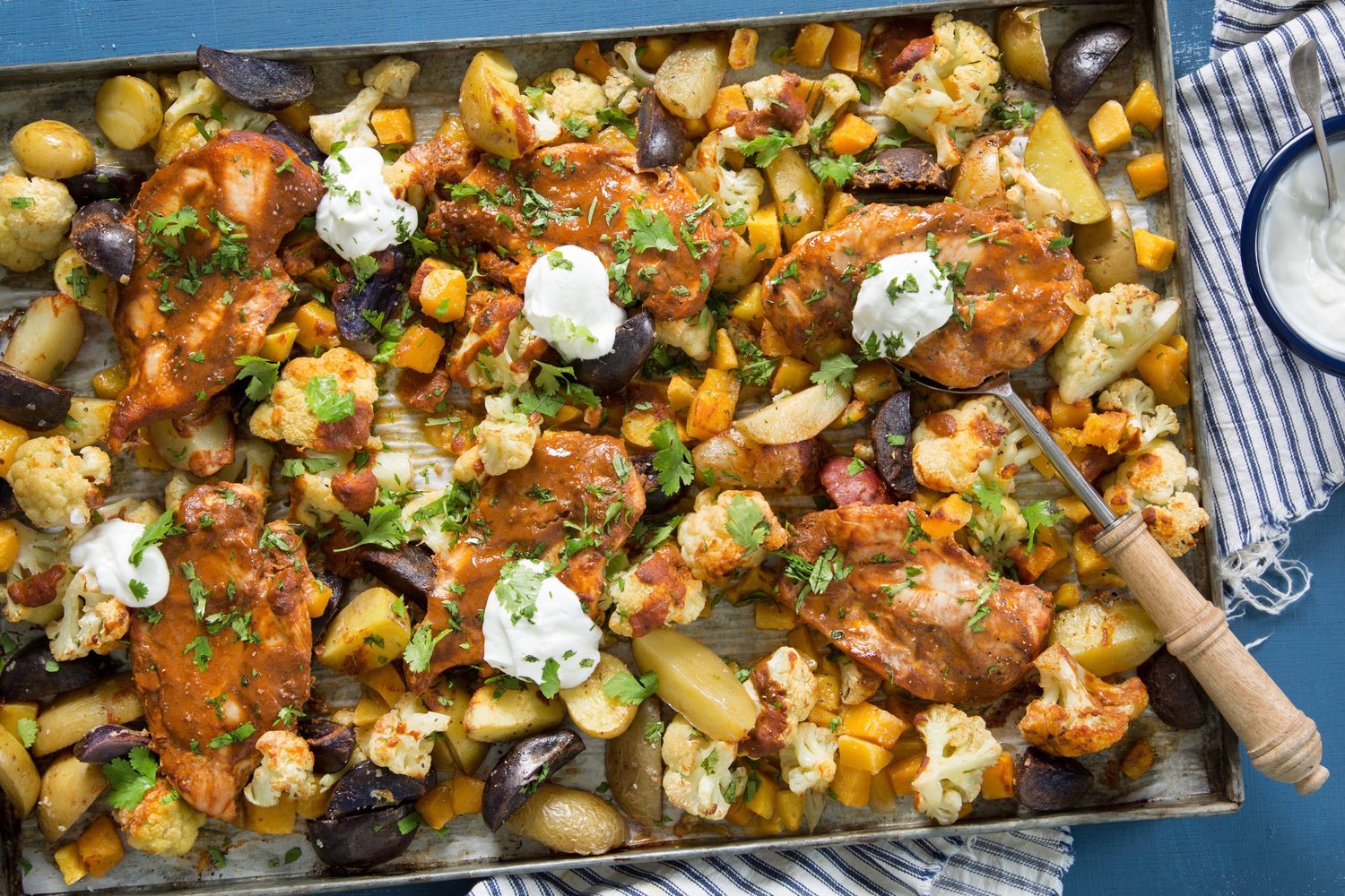 - Toss together both potatoes, cauliflower, oil, cumin, salt, and pepper over a rimmed baking sheet; spread in a single layer, and top with chicken. Drizzle any remaining sauce over chicken.