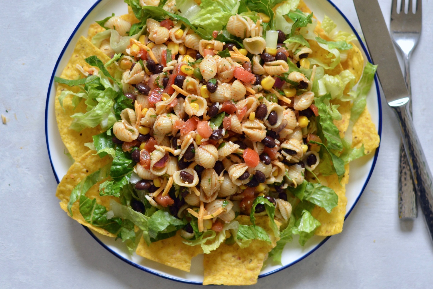 - Toss together pasta mixture, beans, salsa, cheese, and vinaigrette in a bowl. Divide chips among 6 plates. Top with lettuce and pasta mixture.