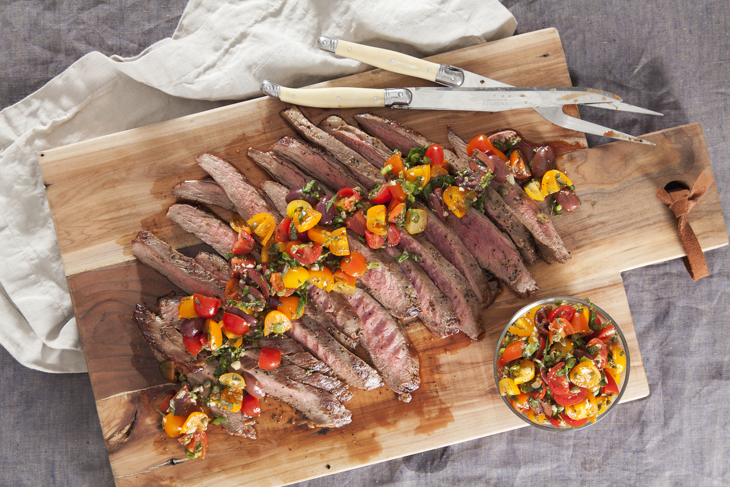 - Meanwhile, stir together tomatoes, olives, basil, onions, garlic, thyme, vinegar, oil and ⅛ tsp salt. Serve topping over steak.