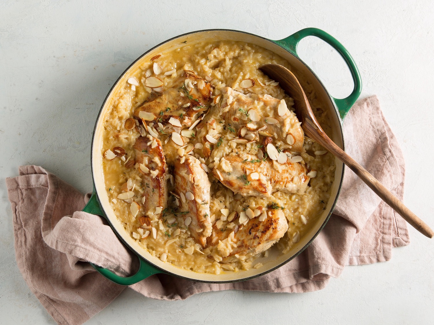 - Whisk together broth and soup in skillet. Bring to a boil, and stir in rice. Nestle chicken in rice mixture. Cover, reduce heat, and simmer 20 minutes or until rice is done. Sprinkle with nuts and thyme.