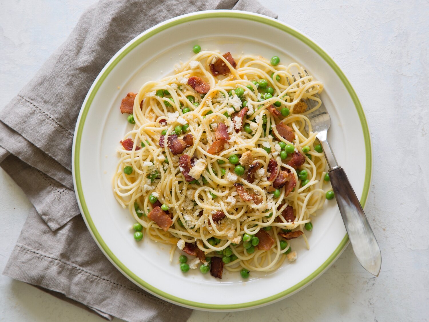 - Very gradually stir in cheeses until melted, adding additional pasta water to thin mixture, if needed. Stir in pasta and bacon; sprinkle with crushed croutons.