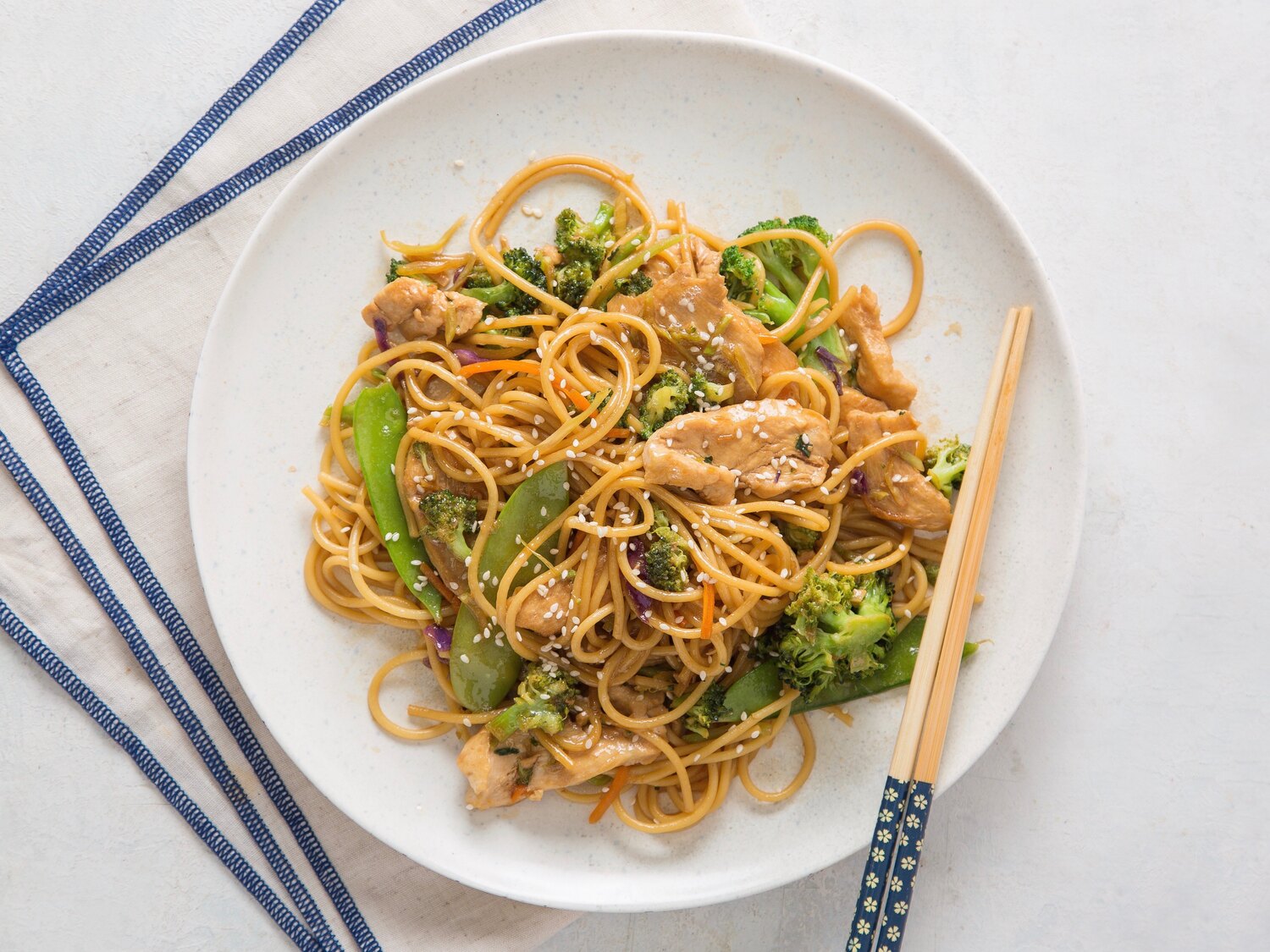 - Add garlic, ginger, soy sauce, broth, vinegar, sesame oil, and honey to skillet. Stir in vegetables; cook 3 to 4 minutes or until vegetables are crisp-tender. Stir in chicken and pasta and, if desired, enough pasta water to thin sauce.