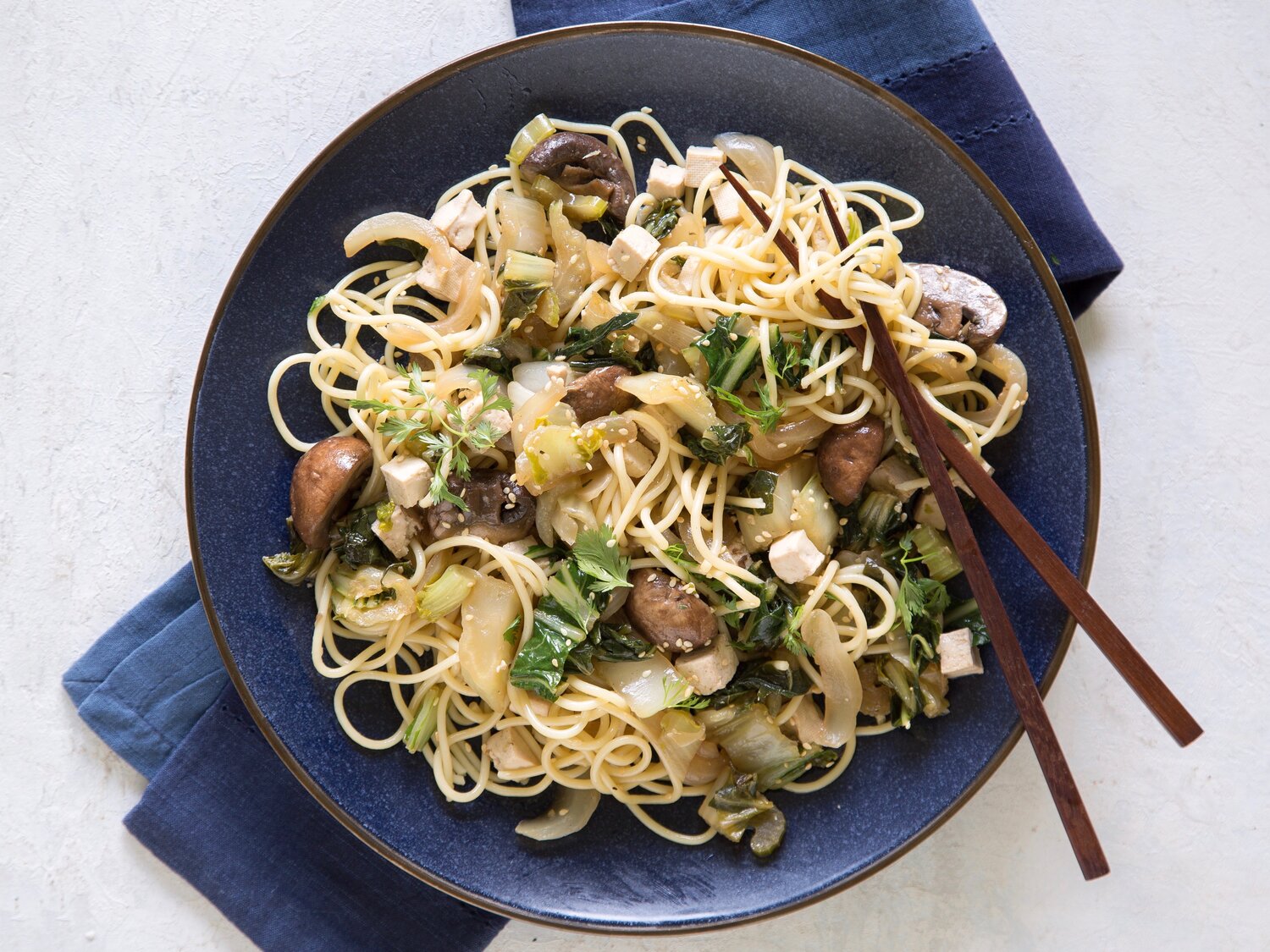 - Cook pasta according to package directions; drain. Meanwhile, cook bok choy, mushrooms, onion, and celery in hot oil in a large nonstick skillet over medium-high heat 8 minutes or until vegetables are tender.