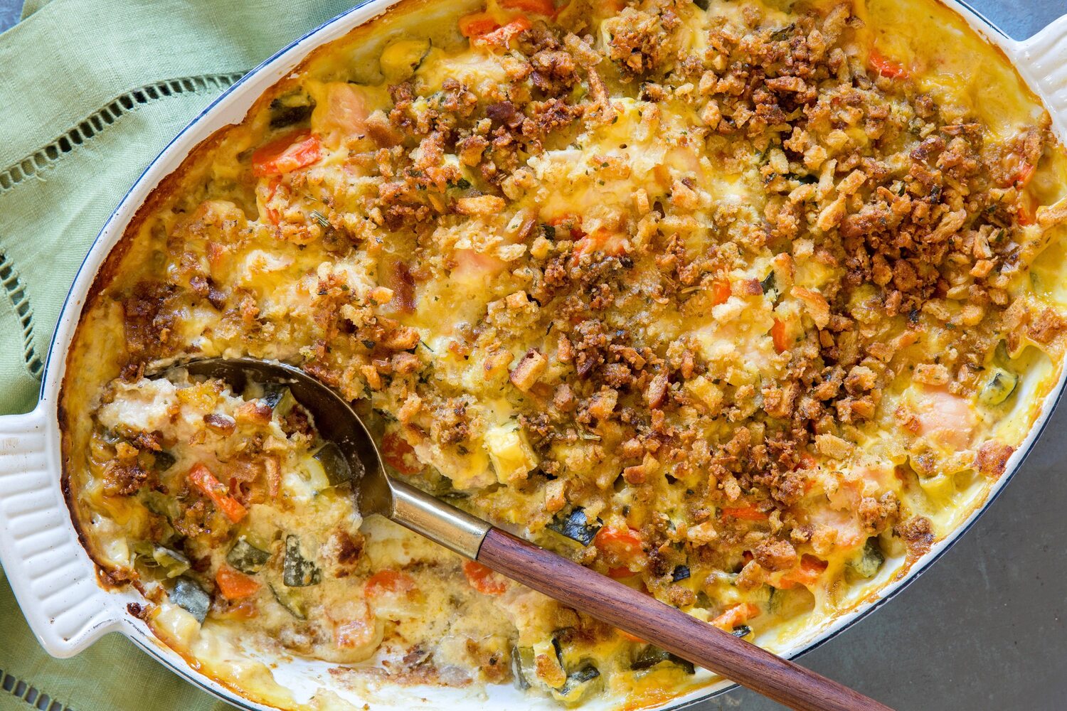 - Cut chicken into 1-inch pieces. Stir together chicken, zucchini, carrots, onion, soup, and sour cream; spread over dressing in dish. Sprinkle with remaining dressing mixture.
