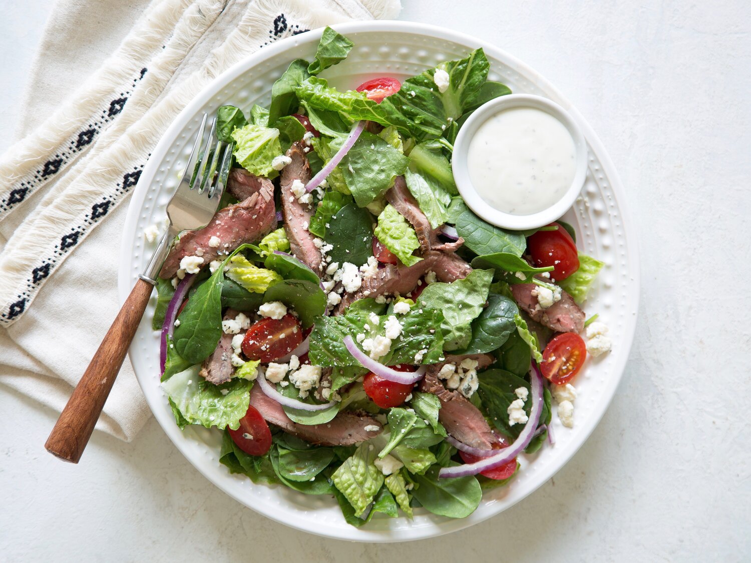 - Divide lettuce and spinach between 2 plates; top with tomatoes, onion, and steak. Drizzle with dressing, and sprinkle with remaining cheese.