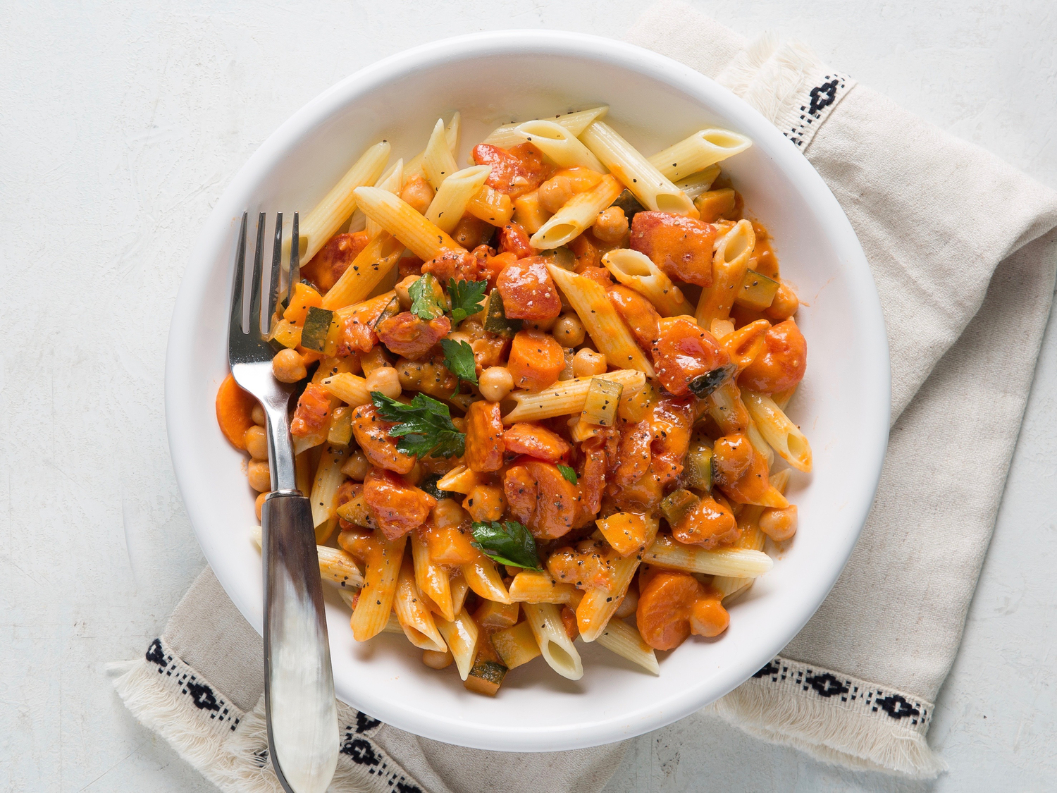 - Add zucchini, chickpeas, and cream; cook 10 minutes or until zucchini is tender and sauce is bubbly. Serve over Herbed Pasta recipe.