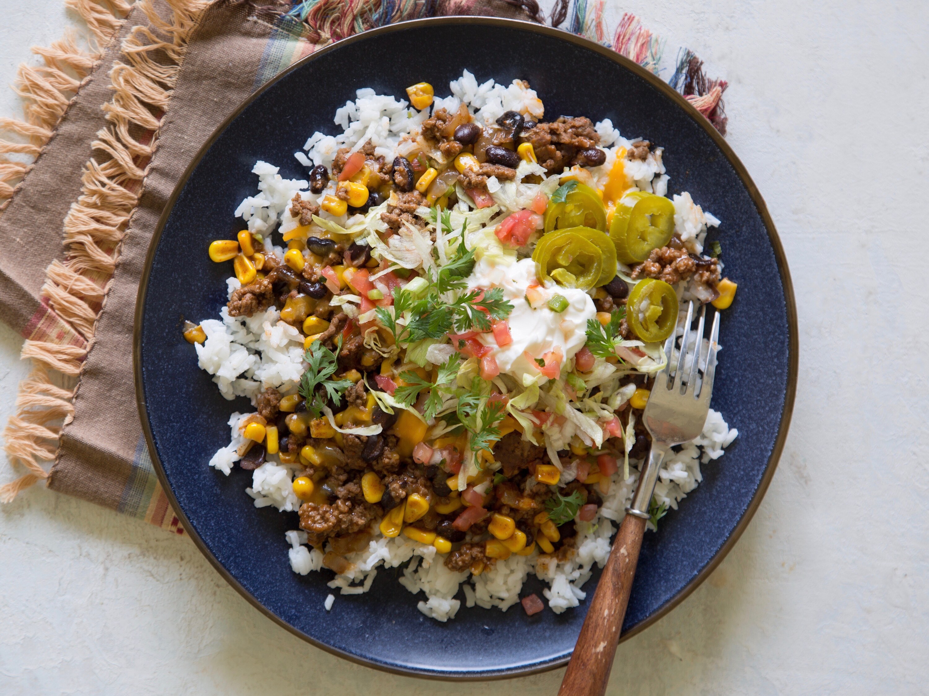 - Divide rice among 6 shallow bowls. Top with meat mixture, cheese, sour cream, lettuce, and tomato.